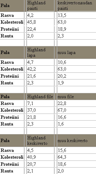 LIHAN SUORAMYYNTIHIGHLAND-LIHA Highlandin liha on erinomaista pihvilihaa. Hitaasta kasvusta ja luonnollisesta ravinnosta sekä kylmästä kasvuympäristöstä johtuen sen liha on erityisen maukasta, lyhytsyistä, vähärasvaista ja väriltään tummanpunaista. Sen lihassa on vähemmän kolesterolia ja rasvaa sekä enemmän proteiineja ja rautaa kuin vastaavassa keskivertaisessa pihvilihassa, sekä runsaasti terveellisiä Omega3-rasvahappoja. ![]() Lähde www.highlandcattle.fi Kaikki tilamyymälässämme myytävät tuotteet ovat lähtöisin omasta karjastamme eli kaikki liha on tuotettu tilallamme. Teuraskuljetukset, teurastukset, lihanpaloittelun ja – pakkaamisen sekä jatkojalostuksen hoitavat ulkopuoliset toimijat ja alihankkijat, itse emme käsittele pakkaamatonta lihaa. HINNASTO Tilapuoti palvelee VAIN sopimuksen mukaan. Soita ja sovi tuloajastasi puh. 044 097 8888. Tervetuloa!